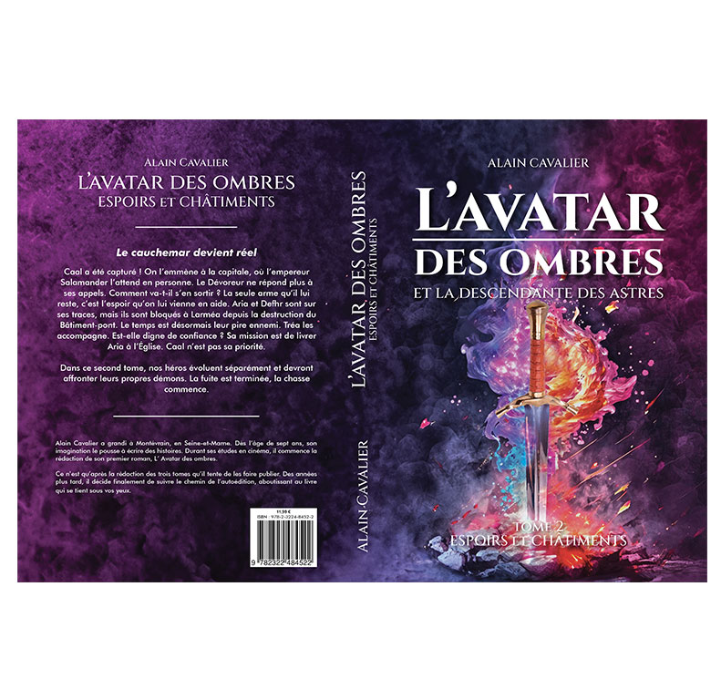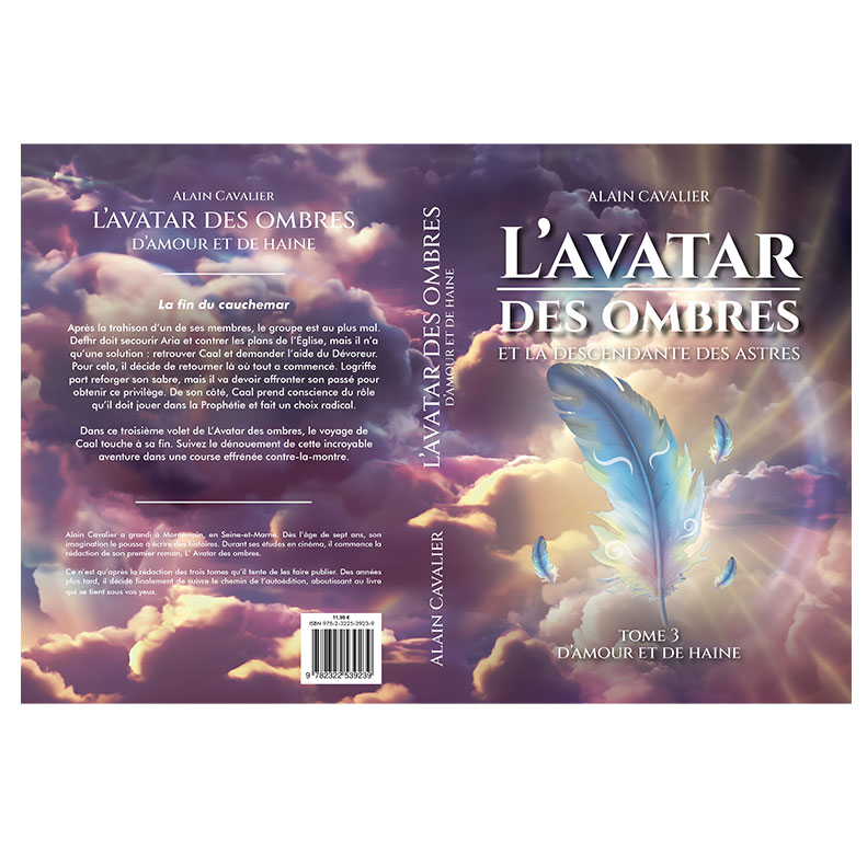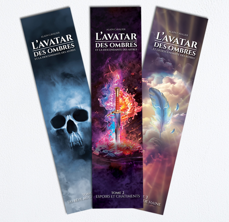 Pour la trilogie L’Avatar des Ombres d’Alain Cavalier, j’ai conçu les trois couvertures officielles, chacune dédiée à l’un des personnages principaux de l’histoire. L’objectif était de créer une identité visuelle forte et cohérente tout en révélant la personnalité, le rôle et l’évolution de chaque protagoniste au fil des tomes. J’ai également réalisé d’autres assets, comme des marque page, un kakémono, etc.